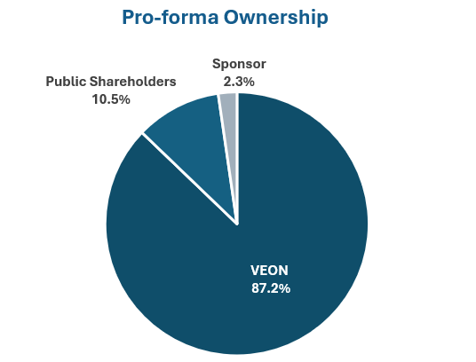 Nasdaq Debut via SPAC: Kyivstar’s public listing is set to occur via a business combination with a special purpose acquisition company (SPAC), Cohen Circle Acquisition Corp I (Nasdaq: CCIR), which is backed by prominent dealmaker Betsy Cohen. Kyivstar is currently a 100%-owned subsidiary of Dubai-based VEON Ltd. (Nasdaq: VEON), which would own approximately 87% post the transaction (actual percentage may vary based on SPAC redemptions and other factors), while public shareholders would own 11%, and the sponsors would own 2%. The pro forma enterprise value (EV) assigned to Kyivstar is ~$2.1 billion, which implies a very reasonable EV/EBITDA multiple of 3.7x, offering investor a highly attractive entry point.