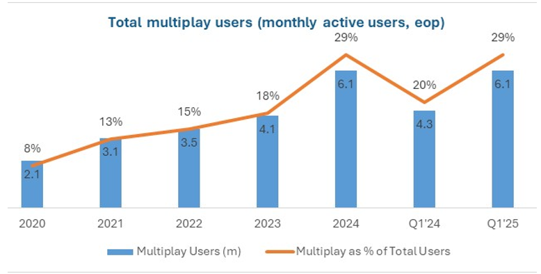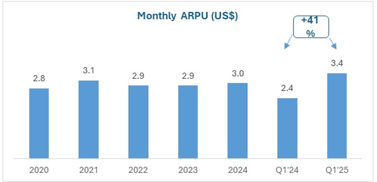 By bundling services (OTT, e-health, and ride-hailing), Kyivstar increases customer engagement and ARPU while strengthening user loyalty. In other words, a Kyivstar mobile subscriber might also watch TV, book doctor visits, and hail rides all through the company’s ecosystem – making them far less likely to churn to a competitor. Kyivstar’s focus on bundling services is paying off and is reinforced by rising demand for its services despite the ongoing war with Russia. The number of customers using multiple services (e.g. mobile voice, data, plus at least one digital app) has nearly tripled from 2.1 million in 2020 to 6.1 million in 2024. This increase in multiplay users has driven up ARPU from about US$2.80 in 2020 to US$3.40 in Q1 2025. The growth in ARPU and subscribers, even during the Russian conflict, highlights the resilience of Kyivstar’s business