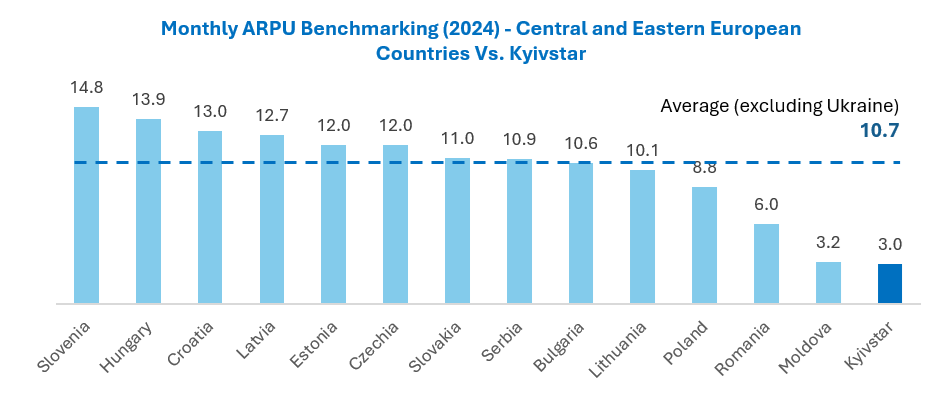 Kyivstar views ARPU expansion as a key pillar of its long-term growth strategy. Ukraine remains significantly underpenetrated (at monthly mobile ARPU of $3.00 as of FY 2024), compared to peer markets in Central and Eastern Europe, where ARPU averages $10.70. This represents a more than 3x monetization gap that Kyivstar is well-positioned to close over time.
