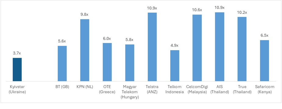 Kyivstar’s long track record of revenue growth and industry-leading profitability makes it one of the most attractive telecom operators in emerging markets. Kyivstar has consistently reported an EBITDA margin of over 50% over the past several years, most recently 59% in 2023 and 56% in 2024. Even for Q1 2025, the company delivered an EBITDA margin of 55%, reinforcing the resilience of the business model despite the ongoing war. This level of profitability underscores the company’s superior operating leverage and disciplined cost management.